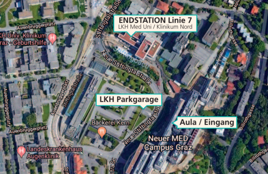 - Straßenbahnlinie 7 bis LKH Med Uni / Klinikum Nord oder